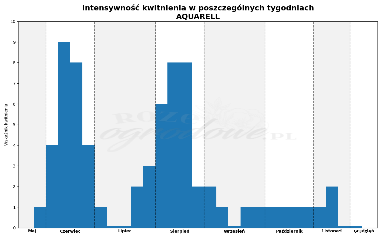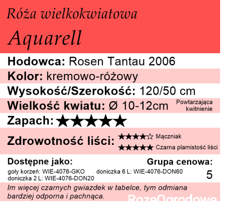 Wiosną ucieszy spragnionych róż ogrodników bo zakwita jako jedna z pierwszych róż w ogrodzie i wcześnie pozwala delektować się zapachem róż z własnego ogrodu lub tarasu. Szczególną cechą Aquarell jest możliwość przeniesienia jej kwiatów do naszych wnętrz gdzie swoją barwą i wypełniającym pomieszczenie intensywnym zapachem potrafi utrzymywać się przez tydzień.