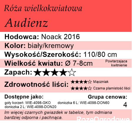 Jeśli poszukujesz róży, która doskonale łączy cechy odmian wielkokwiatowych i parkowych, albo po prostu nie jesteś pewien, na którą się zdecydować, a jednocześnie uwielbiasz pachnące róże w delikatnych pastelowych kolorach, Audienz to doskonały wybór, który z pewnością spełni Twoje oczekiwania.
