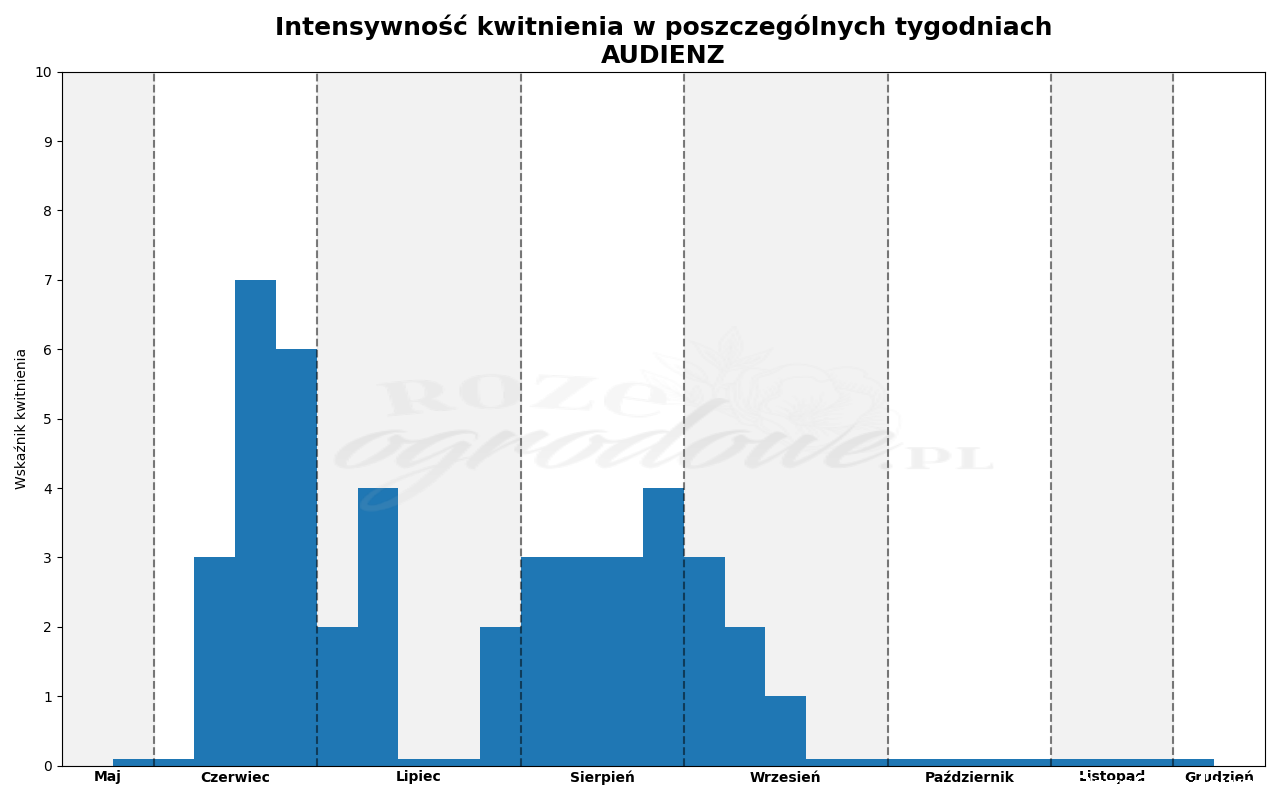 Zebraliśmy dane dzięki którym możemy przedstawić jak w naszych warunkach, tydzień po tygodniu kwitły poszczególne róże. Różę Audienz zaliczyliśmy do róż późnych. Pierwsze kwiaty pojawiły się od razu w większej ilości w drugim tygodniu czerwca. Szczyt kwitnienia nastąpił już w kolejnym tygodniu, zakwitło 70% pąków. Pierwsze kwitnienie trwało pięć tygodni do połowy lipca. Po dwóch tygodniach przerwy zakwitła ponownie i drugie kwitnienie trwało dziewięć tygodni, do trzeciego tygodnia września. Było spokojniejsze, bardziej rozciągnięte.