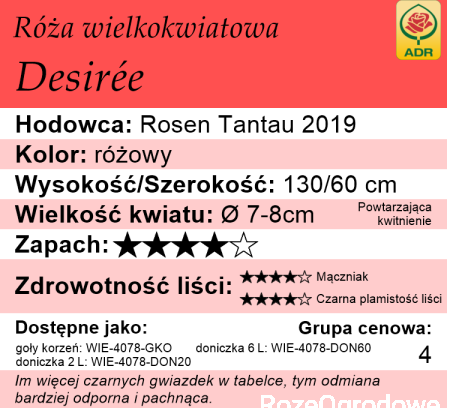 Desiree jest to wybitnie zdrowa, a zarazem piękna róża wielkokwiatowa od firmy Tantau. Za swoje walory dekoracyjne, długie kwitnienie oraz bardzo dobrą zdrowotność została nagrodzona certyfikatem ADR.