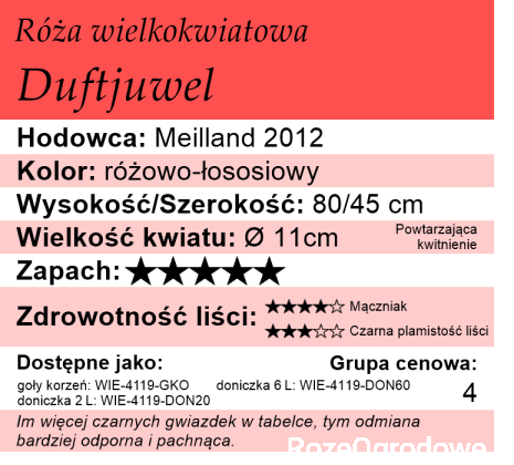 Róża Duftjuwel została wyhodowana przez Meilland w 20212 roku.