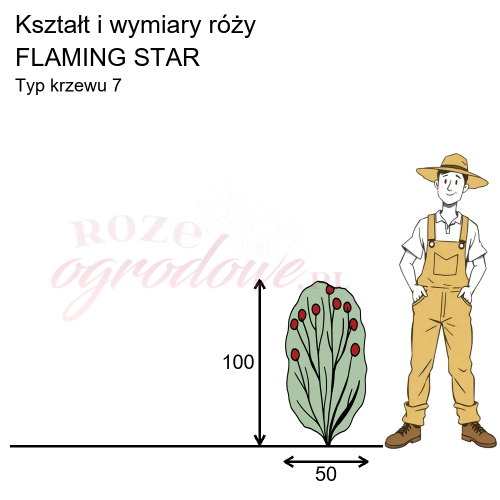 Róża Flaming Star dorasta u nas do 100cm wysokości i 50cm szerokości. Zbudowała smukły krzew o zwartym i wzniesionym pokroju. Pędy tej róży są długie, mocne i rosną pionowo. Kwitnie w górnej części krzewu, jak większość róż wielkokwiatowych.