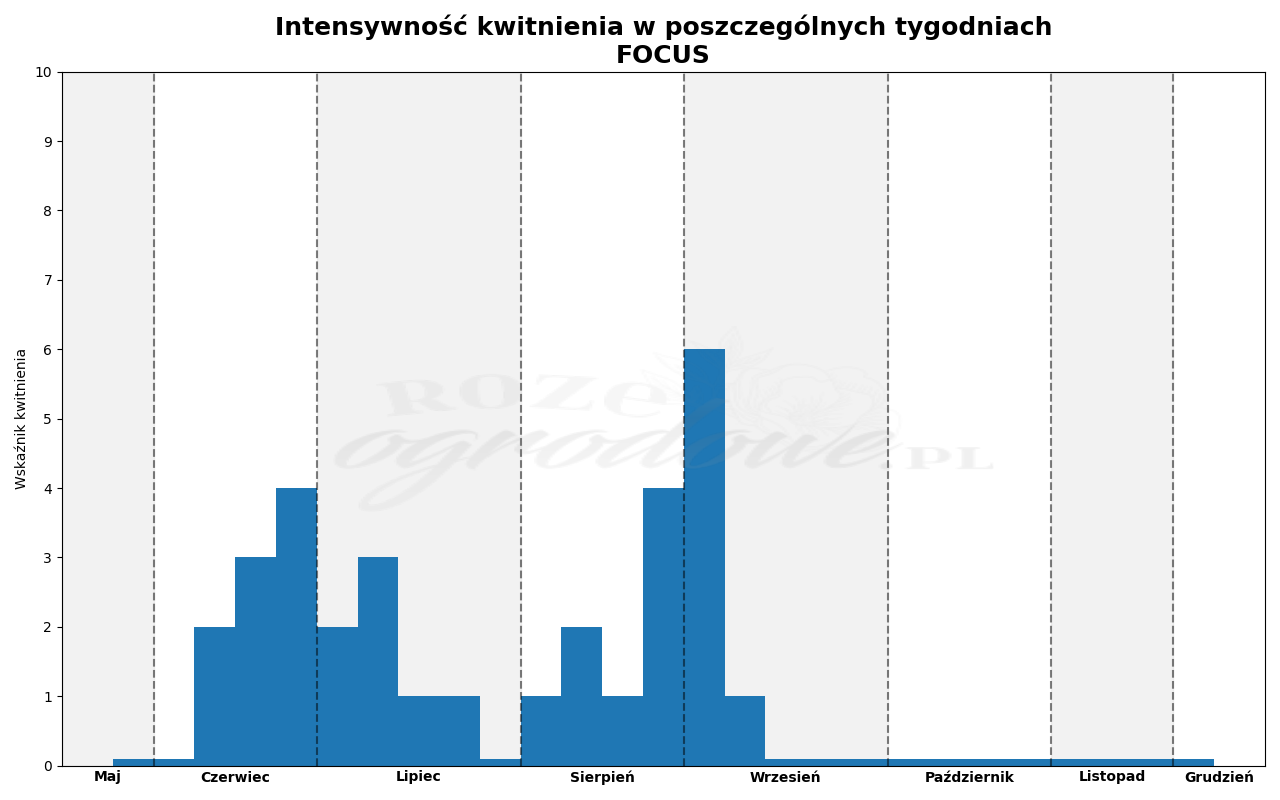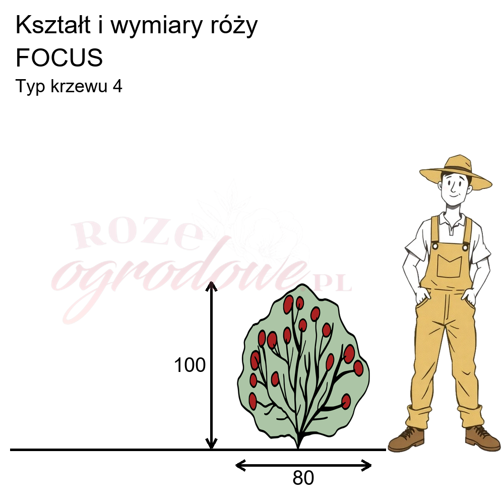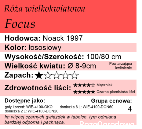 Różę Focus zaliczono według klasyfikacji Noack Rosen do róż wielkokwiatowych. Jednak, patrząc na nią w ogrodzie, wielu z nas miałoby problem określić, czy to róża rabatowa, czy też wielkokwiatowa. Istnieje kilka powodów tego niejasnego przyporządkowania.