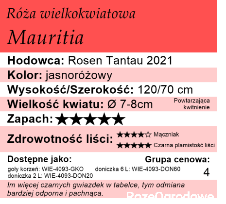 Po pierwsze- odmiana ta bardzo przypomina stare róże historyczne o pełnych, mocno pachnących kwiatach, bo faktycznie kwiaty te niebywale mocno pachną i mają piękną, nostalgiczną budowę. W przeciwieństwie jednak do wielu róż historycznych Mauritia spełnia współczesne wymagania ogrodników pod względem odporności na choroby grzybowe. I właśnie połącznie tych trzech cech, które nie jest proste do osiągnięcia daje tak wyjątkową odmianę, którą doceniają najlepsi specjaliści na świecie.