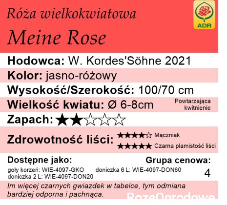 Kordesowi udaje się to coraz częściej, a róża Meine Rose jest tego doskonałym przykładem. Jej zdrowotność potwierdzona certyfikatem ADR sprawia, że możemy ją polecić nawet tym, którzy dopiero zaczynają swoją przygodę z różami. Różowe kwiaty z ciemniejszym środkiem posiadają to charakterystyczne, klasyczne piękno róż, które wielu z nas poszukuje.