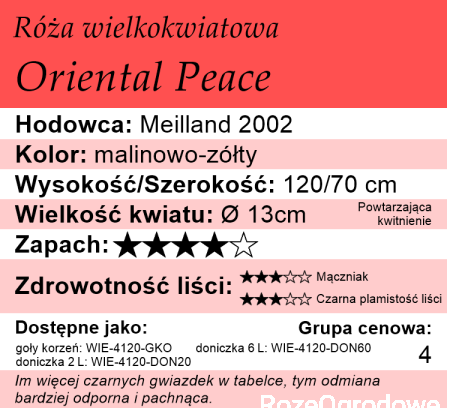 Róża wielkokwiatowa Oriental Peace jest ceniona i przyciąga uwagę w ogrodach swoją dwukolorową barwą. Kwiaty są duże, które stopniowo zmienią się od malinowego do żółtego. Zapach jest delikatny o nucie herbaty owocowej. Krzew rośnie wzniesiony, ma grube, sztywne pędy, dzięki którym utrzymują się ciężkie kwiatostany. Równie dobrze powtarza kwitnienie. Ozdobą są również ciemnozielone, zdrowe, błyszczące liście. Stanowią doskonałe tło dla jaskrawych kwiatów.Oriental Peace lubi stanowisko słoneczne, przewiewne ale osłonięte od silnych wiatrów, dobrze znosi deszcze.