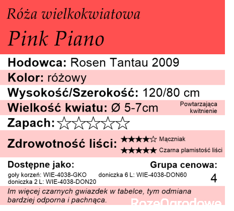 Bardzo ciekawa odmiana wprowadzona na rynek przez firmę Rosen Tantau w 2009 roku. Róża z grupy piano, której początek w 2007 roku dała czerwona odmiana Piano (zobacz).