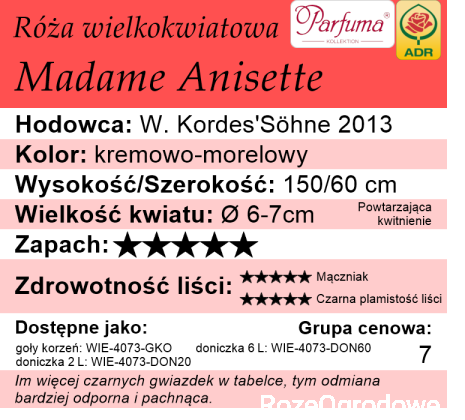 Mnie osobiście przypomina polskiego Chopina ze względu na kolor i wigor. Jednak Madame Anisette deklasuje Chopina swoją zdrowotnością. Wtedy kiedy Chopin miewa problemy z mączniakiem prawdziwym, a jesienią zdarza mu się, że dolne pędy są ogołocone to Madame Anisette nawet gdy osiągnie 2m wysokości, od dołu do samej góry pokryta jest gęstym, zdrowym listowiem.