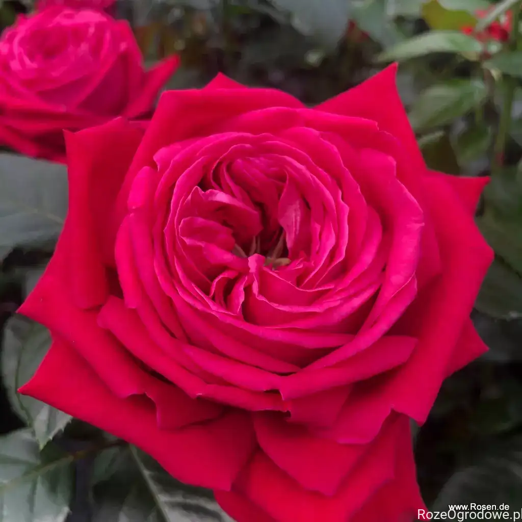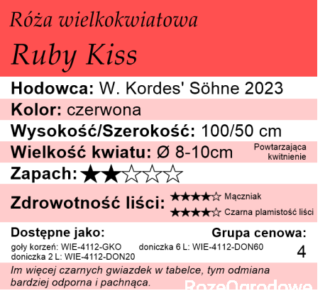 Róża wielkokwiatowa Ruby Kiss to odmiana która łączy urok dawnych róż romantycznych z doskonałą odpornością nowoczesnych odmian. Rośnie pionowo, pędy są sztywne i grube. Dzięki temu kwiaty nie zwieszają się. Krzew wypełniony jest pełnymi kwiatami w odcieniu winno - malinowym. Płatki mają aksamitną strukturę, które po rozkwitnięciu przybierają kształt miseczki. Delikatny i subtelny zapach z wyczuwalnymi nutami owocowymi. Wyjątkowo zdrowe liście, rzadko spotykane w różach wielkokwiatowych, sprawiają, że wszelkie obawy dotyczące chorób grzybowych są zbędne w przypadku tej wytrzymałej róży. Kwiaty są trwałe, dobrze utrzymują się na krzewie . Powtarza obficie kwitnienie . Pierwszy rzut zaczyna się w czerwcu. Roślina najlepiej czuję się w pełnym słońcu, toleruje lekki półcień.