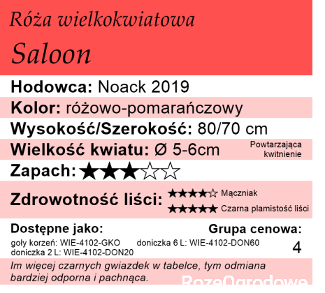 Czasami oceniając różę na pierwszy rzut oka, może wydawać się ona banalna. Jednak przy dłuższej obserwacji zauważymy, że jej dekoracyjność utrzymuje się tygodniami. To dzięki zdolności do ciągłego wytwarzania nowych pędów, wolnemu starzeniu się kwiatów, doskonałej tolerancji na deszcz oraz pięknym, błyszczącym liściom, które są odporne na choroby. W przypadku odmiany Saloon ta kompleksowość cech jest szczególnie widoczna.