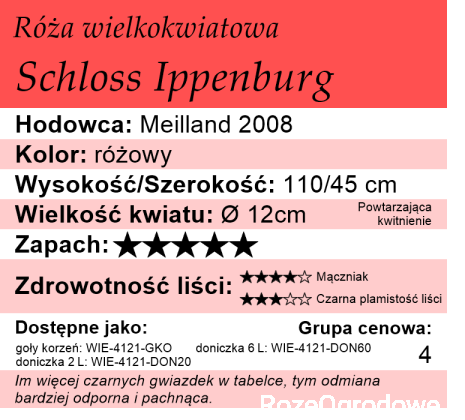 Róża wielkokwiatowa SCHLOSS IPPENBURG jest to klasyczna piękność o bardzo eleganckim pokroju. Jej porcelanowo - różowe kwiaty wyróżniają się na tle zdrowych, ciemnozielonych liści. Kwiaty są bardzo duże, pełne o średnicy 12 cm. Krzew jest stosunkowo wąski u podstawy, ale rozkłada się u góry, tworząc koronę. Pędy są grube, sztywne i proste dzięki temu roślina nie wymaga podpór przy obciążeniu kwiatami. Schloss Ippenburg pachnie bardzo ładnie, intensywnie, jest wyczuwalny z daleka o nucie cytrusowo - kwiatowej. Lubi stanowisko słoneczne, w cieniu kwitnienie będzie skąpe,a pędy będą wiotkie. Jest odporna na deszcz oraz na choroby grzybowe typu czarna plamistość czy mączniak.