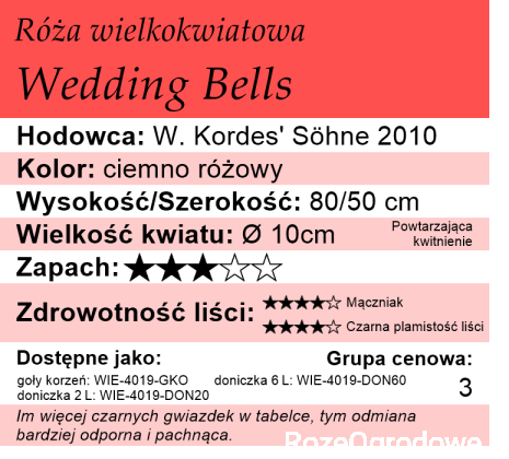 Wedding Bells posiada duże, pełne kwiaty o klasycznej formie z lekko podwijającymi się płatkami, które nadają jej wdzięku.